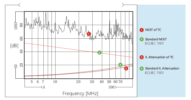 | Near End Crosstalk Attenuation (NEXT, dB) | 76 | 79 | 65.1 | 58.2 | 62.9 | 52.9 |